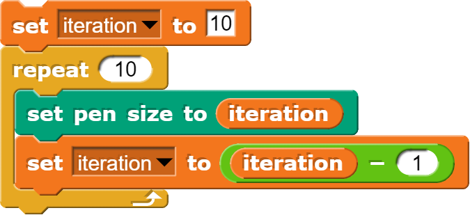 Then to get the leaf to change size every iteration, you could create a variable called "iteration" to keep track. If you were working from the bottom to the top of Aya, you would want the line to be smaller as you go, subtracting one from the iteration number each time would make the pen smaller in each iteration.