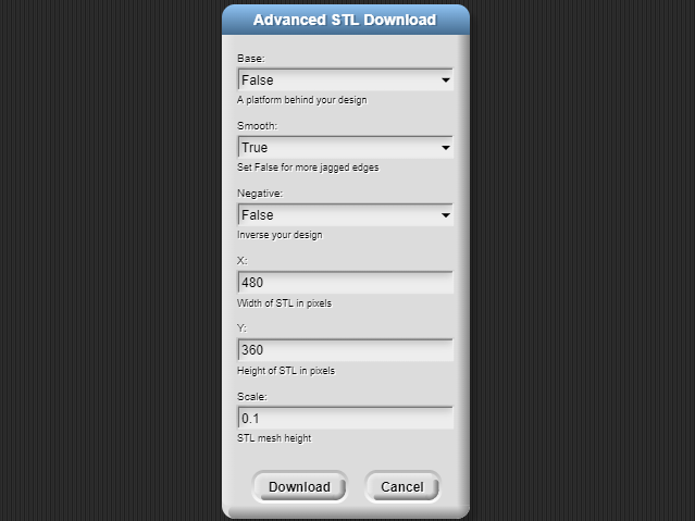 Once you have made your modifications, right click the stage. You will then see two options: STL and Advanced STL. Both will convert your design into a STL, which is a filetype that 3D printers can understand. The second option will allow you to specify a variety of different attributes for your STL. Once you select your option, it will then convert and download your file. Note that this can take a minute or two, so please be patient.
