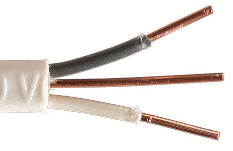 This is called “NM cable” (because the outer part is “non-metallic”). There are three wires inside the sheath. This exterior sheath is color coded: white for 14-gauge, yellow for 12-gauge, orange for 10-gauge. The wires inside have one bare copper (for ground) and two for the current.