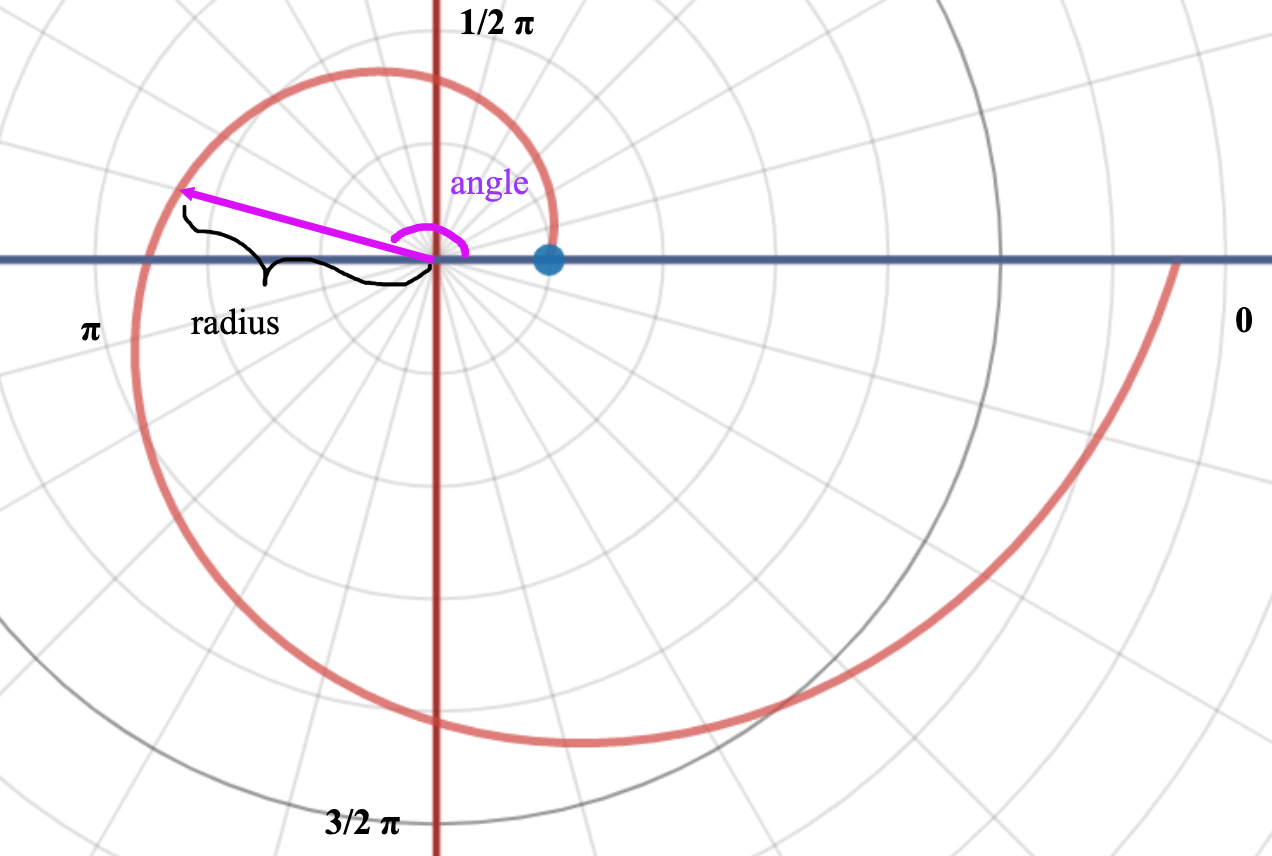 What is relative angle? If we don't consider the rotating of each spiral and consider its starting direction to be angle zero, each point will then just be identified by the radius and its angle. (r, t). [θ - 'theta']