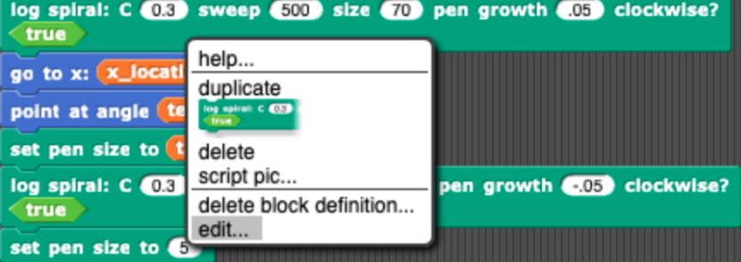 Move your mouse on the log spiral blocks, right click “edit”, you could find some scripts that directs the pen collectively: (if it's overwhelming at first to look at, don't worry)