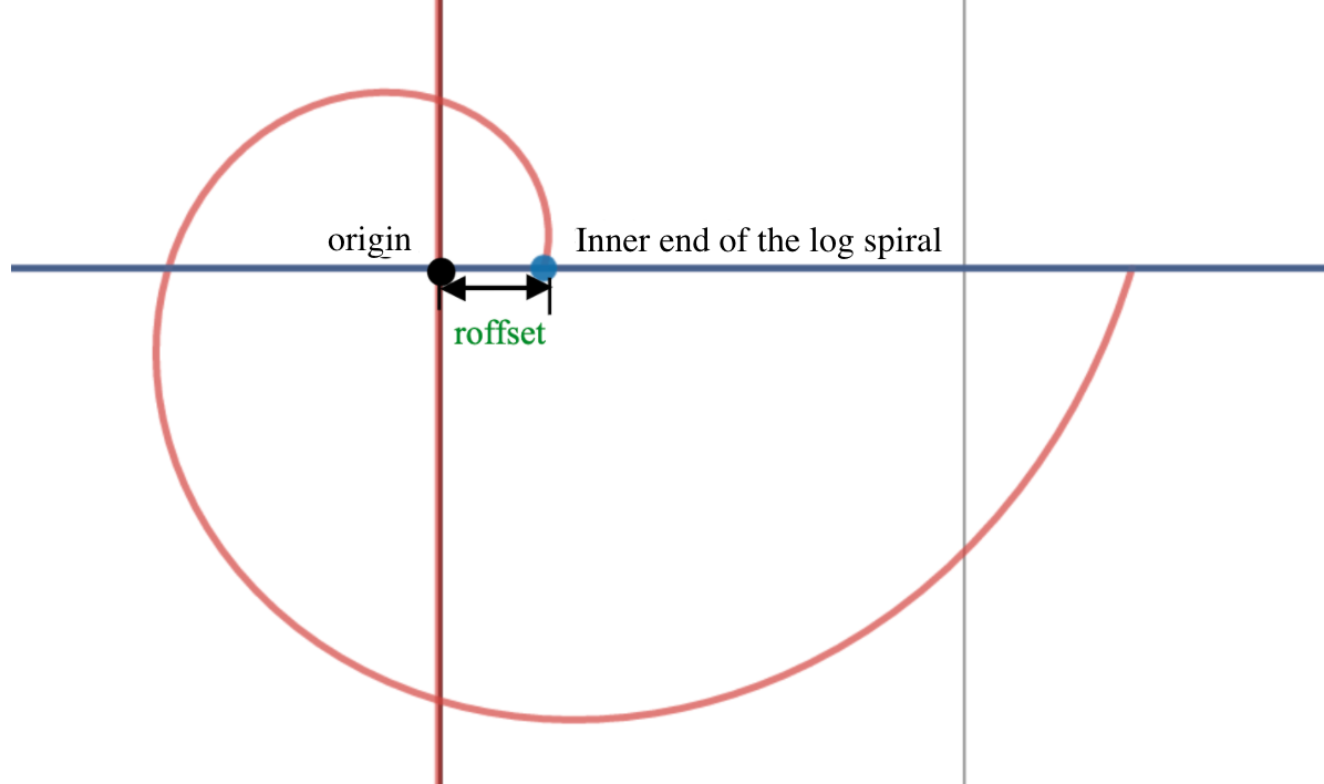 Because we are simulating a continuous curve created by drawing or carving, we do not want to have an unexpected gap between the end of one line and the start of the spiral. So we need to measure the gap and compensate for it. We call this “roffset”, the distance between the center of the spiral and where the spiral ends at the inside.
