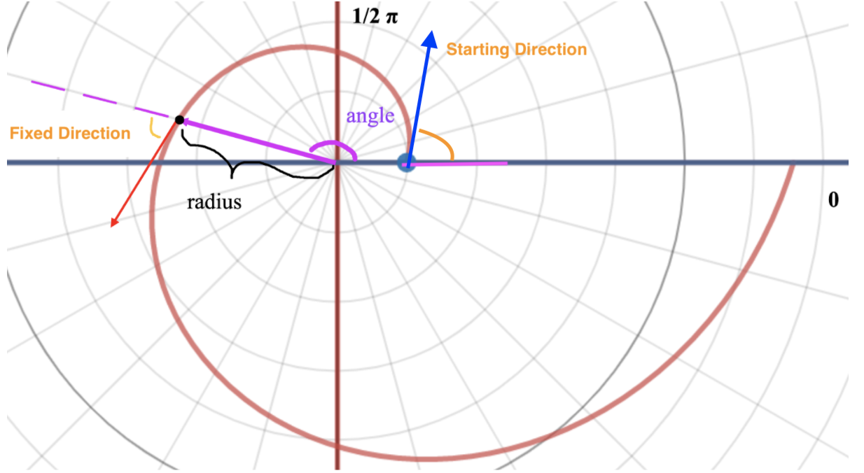 Since the angle stays the same in every point of the spiral, including the point which we start drawing from, we will call this a “fixed direction”. When we are at the starting point, we use this to calculate “Starting Direction”, matching the starting direction variable in the script.