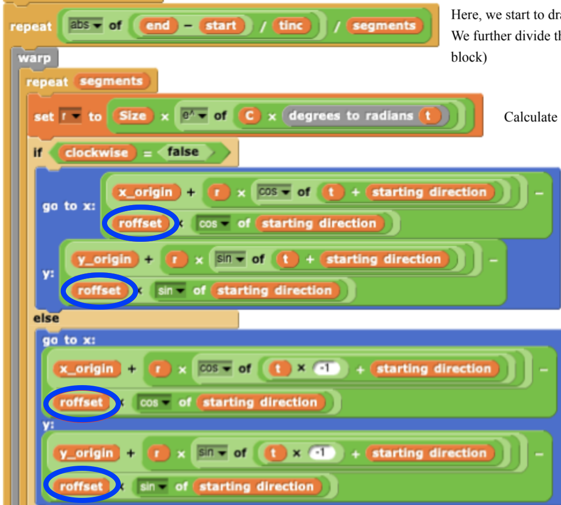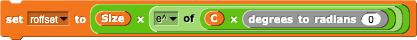 Going back to the stack of blocks that you see behind the log spiral block, this is the block that calculates roffset, which we store in the script variable roffset.