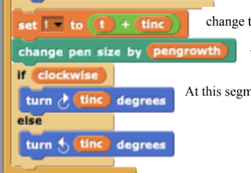 The “segments” are very small increments of straight lines that draw the spiral. So small that the human eye sees them joined as a curve. We draw these little portions one by one with the increase of “tinc”(theta increment). - which we add to the “t” (theta). Theta is the relative angle that we calculate the radius from.