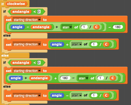 These blocks set the initial starting direction based on user input of the endangle (which has the same value as sweep), and check whether the spiral shape is clockwise or not.