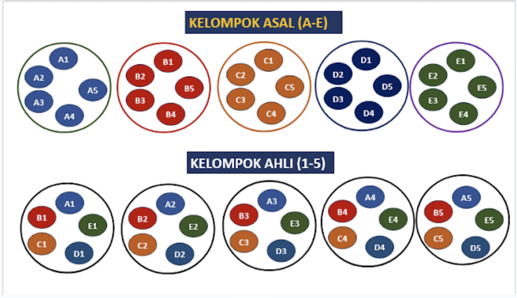 - Kelompok Asal: Kelompok asal terdiri dari siswa yang memiliki latar belakang atau topik yang berbeda, tetapi bekerja sama untuk menggabungkan informasi yang telah dipelajari oleh setiap anggota kelompok ahli. Tugas kelompok asal adalah mendiskusikan informasi yang dibagikan oleh anggota kelompok ahli, menyusun kesimpulan, dan menyelesaikan tugas atau proyek yang lebih besar dengan mengintegrasikan pengetahuan dari semua topik.