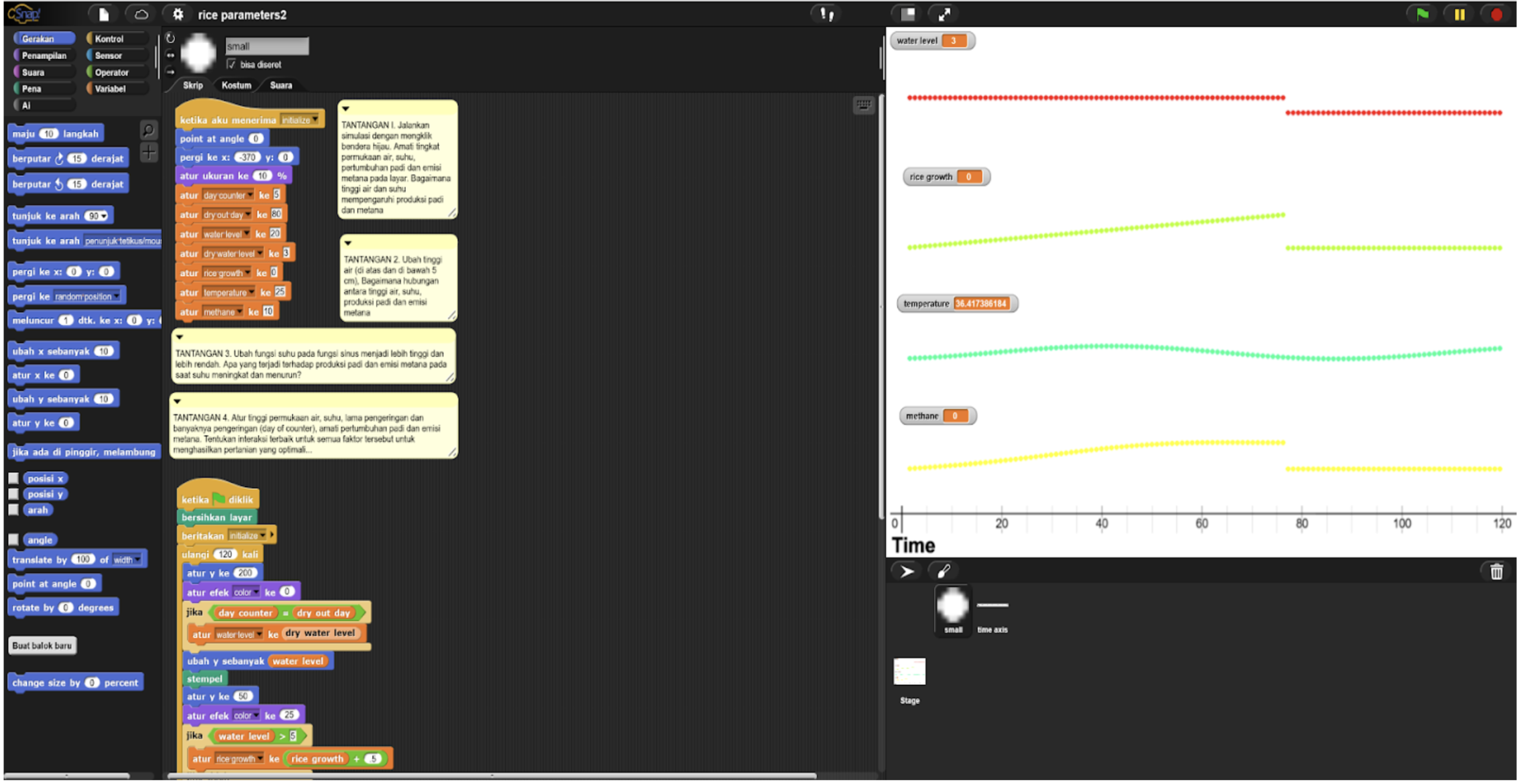 - TANTANGAN 4. Tujuan: Menganalisis bagaimana perubahan dalam level air, suhu, dan emisi metana saling mempengaruhi dalam pertumbuhan padi. Instruksi: Atur tinggi permukaan air, suhu, lama pengeringan dan banyaknya pengeringan (day of counter), amati pertumbuhan padi dan emisi metana. Tentukan interaksi terbaik untuk semua faktor tersebut untuk menghasilkan pertanian yang optimal.