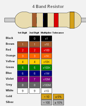 The chart for all the colors are below. If you want to check to make sure you have the right value or color sequence, you can use one of the handy applets that are available online for that purpose. There is also a 5-band system that has a 3rd digit, and a 6 band system that includes temperature tolerance, but you probably will not encounter those in our studio.