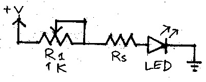 For example, (9volt supply - 3.0 volt drop)/0.01amps = 600 ohms