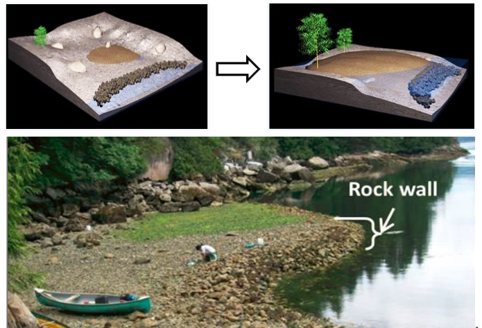 Another important set of engineered ecosystems occurred in water. In the Pacific Northwest, Indigenous nations created clam gardens. Normally the ocean creates a sloping shoreline with a tiny clam population. By creating rock walls of proper height, sandy shallows perfect for clams can be created. Archaeologists have dated some back 5,000 years. In Alaska, “stream sculpting” by native peoples was used to increase salmon spawning grounds.