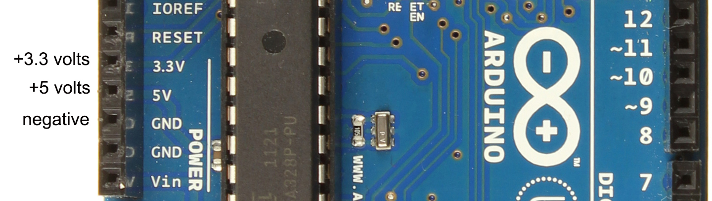 To supply power to your protoboard you can find a power supply in our cabinet, but an even easier source is to just plug in your Arudino via the USB cable to your computer. The Arduino has +5, +3 and ground (negative) connectors that take the same 22 gauge wire as your protoboards.
