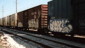 For tagging on the insides of trains, permanent markers worked, but using spray cans of paint quickly became popular as well, especially for tagging on the outside of trains. Graffiti became so much more than simple tagging, however. Graffiti writers, in addition to getting their name around as much as possible, would try to outdo each other in terms of style. At first, writers would try to make their tags (or signatures) more stylish than anyone else's. Later on, they would add more colors, special effects, and they'd make their name bigger. Spray cans allowed large pieces of graffiti to be created fairly quickly which was important because writers didn't want to get caught by the police or people working for the MTA (Metropolitan Transit Authority). As you will see in the Graffiti Styles section of this website, graffiti really evolved into a complex art form with its own techniques and vocabulary. From simple tags on the insides of trains to throw-ups to masterpieces that spanned multiple subway cars, the art and science of graffiti grew in leaps and bounds.
