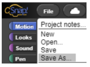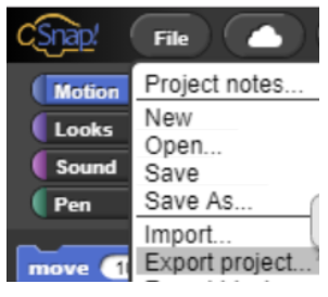 There are two ways to save the projects you make with the CSDTs. You can save it to the cloud in your CSDT account, or you can export the project to your local computer. Both ways happen from within the CSDT tool. CSnap is shown below: