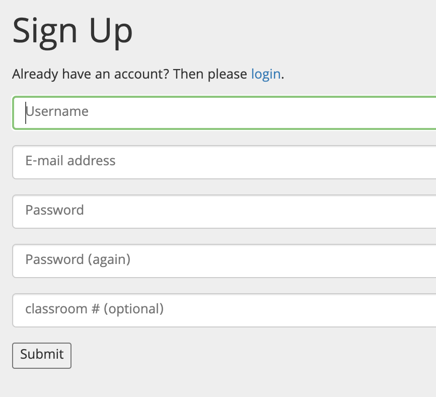 Choose a user name and enter it into the first box. Enter your email address into the second box. If you do not have an email address or do not wish to enter one, you can make one up. Think up a password and enter it in the next two boxes. If you are a student and your teacher provides you with a classroom number, enter that in the last box. Click the submit button.