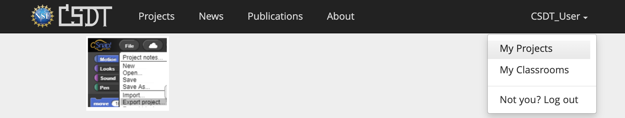 When you save your projects to the CSDT cloud, you can view all of your work on the CSDT site. Once you are logged in, click on your username in the upper right hand corner of the window: