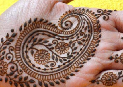 One of the oldest and most popular designs is the paisley. The oldest examples (7th century silk) show a fruit on a tree. One theory is that this represents the Indian mango. By repeating similar curved shapes at many scales, the henna artists are creating a complex mathematical form called “fractals”. The complexity means that the bride will have to sit still for a long time, so her friends have to keep her entertained. In this way henna brings everyone together.