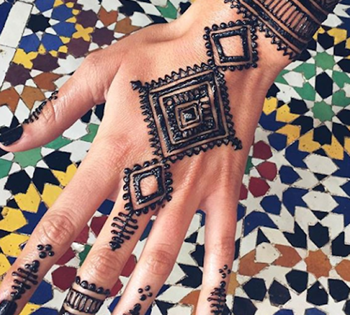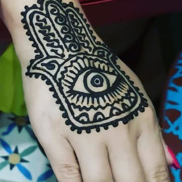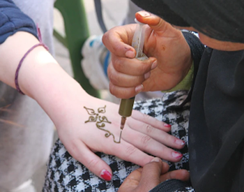 The earliest known use of henna dye was found in the hair of an Egyptian mummy from 3400 BCE (5,400 years ago!). She had dyed what we would now call “extensions” in her hair. One ancient design still popular today is the hamsa, a hand with an eye in the center. It is said to ward off the “evil eye” (a curse created by staring). This example is from the Marrakech Henna Art Cafe in Morocco. In North Africa it is called the hand of Miriam by Jews; the hand of Mary by Christians, and the hand of Fatima (Muhammad's first daughter) in Islam. Perhaps because henna is shared across many faiths, it often appears in peace celebrations.