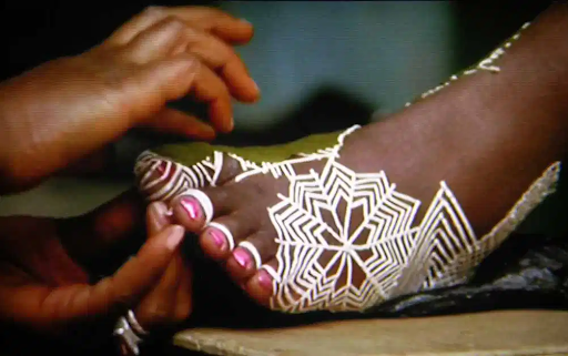 In West Africa the designs are not drawn on the skin. Rather thin strips create a design where the henna will not stain. Then the henna is applied everywhere. Once it is washed off, the strips can be removed. So the west African designs tend to use straight lines. When our research team was in Mali we asked what the repeated triangles meant. The women creating designs said they were the scales of a fish. With good luck you will catch a bigger fish each time, so that is why the triangles increase in size. Henna is not only carrying ancient traditions, but new innovations as well. One new technique is to arrange straight lines along a curve, so that the patterns look like leaves or feathers, as shown in this baby naming ceremony in Bamako, Mali (Photo by Katie Orlinsky).