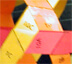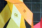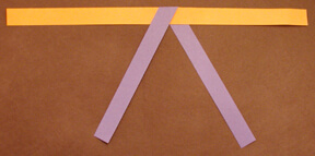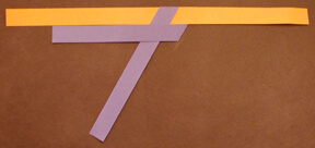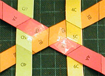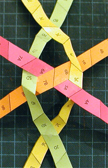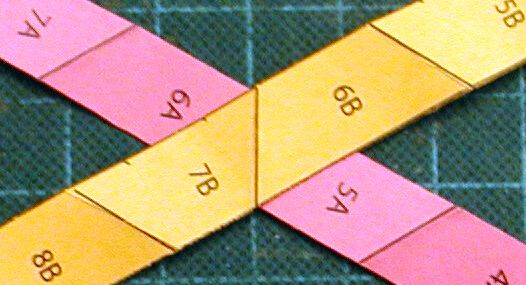 Tape over intersections after each step. Always place folds onto folds in the same direction. Note that each strip color is also a letter: red=A, Orange=B, Yellow=C, Green=D, Blue=E