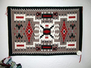 Much of the writing about Navajo weaving talks about Navajo rugs as commodities that have been traded away or sold to non-Navajos, and how the traders have historically encouraged the Navajo weavers to incorporate different patterns that would fetch higher prices. While it is definitely true that Navajo rugs and blankets have been an important part of the commerce of Navajo society, we need to remember that they are much more than that as well. For the weavers, wealth, art, beauty, and philosophy are all part of the same cosmic whole. Navajo rugs, therefore, are more than just decorative art to be sold to non-Navajos. Even though the rugs are often sold, the process of weaving is considered serious and personally meaningful work.