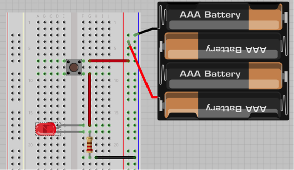 You can see that instead of the longer end of the LED being directly connected to the power supply, it is connected to one leg of the pushbutton. DON'T FORGET THE RESISTOR THAT IS CONNECTED TO THE LED. Experiment with pushing the button. What happens? What do you think the button is doing that allows this to happen?