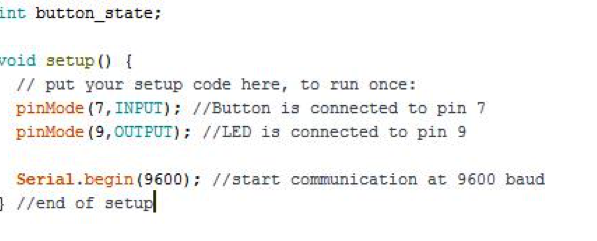 In your code, we will still need to declare the LED as an output. We will also declare the pin the button is connected to as an input. The last part of our setup is starting the communication between the Arduino and the computer. This is done by adding a Serial.begin() line. The number between the parentheses indicates how quickly the Arduino and computer communicate in bits per second (baud). For now we will use 9600 baud.