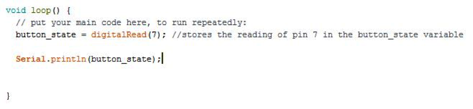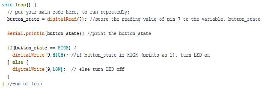 The function of the main code is to turn the LED on and off depending on whether the button is pushed or not. In order to do this, we need to know the state of the button. digitalRead allows us to read the state of the button. We will use the variable we created at the beginning of the code to store this value that is being read.