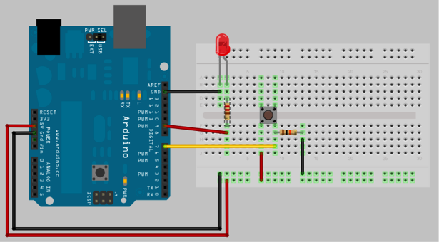 This is an example of manipulating an output using hardware, or physical components. We can also achieve the same effect through code. Open a new sketch and wire the circuit shown below. As you can see, the wiring is a bit different because now the LED and button are not directly connected but are instead connected to the Arduino.
