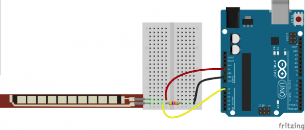 The flex sensor has a similar setup as the pressure sensor. Since the hardware components are so similar, this example will just introduce more coding functions. The goal of this system is to control the rate at which the LEDs flash using the flex sensor. First, wire the flex as shown below: