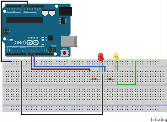 Now add the two LEDs onto the breadboard and connect them to two different digital pins as shown below: