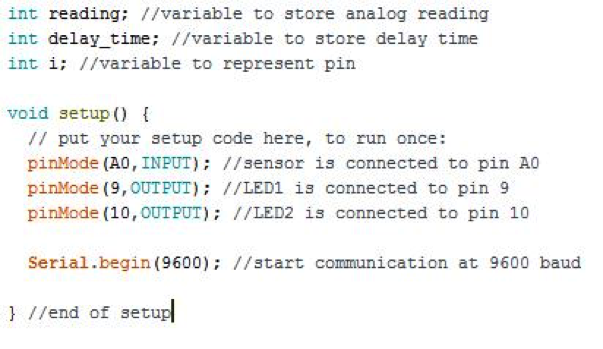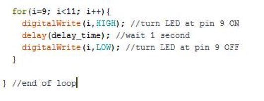 That turns one LED on and off, but what if we wanted to control more than one? For this we will use a for(initial, condition, increment) loop. The for loop requires three parameters: the starting value, a condition that must be met, and a increment. For example, if I want to start off at pin 2, I will create a variable that represents the pin number I am currently controlling. In this case, the variable is a lowercase i. The initial value will then be 2. The condition is as long as the pin number is less than 4 and the increment will be add one. So as long as the pin number is less than 4, it will execute the code in the loop. The code in the loop will be the code we wrote above which turns the LED on and off.