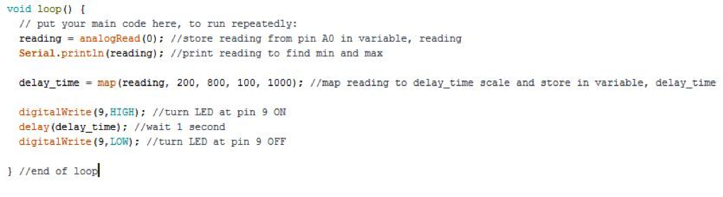 For now, we will focus on turning a single LED on then off. Remember from the previous lesson that in order to do this, we need to write the pin HIGH then LOW. However, if we do this the LED will turn on and off so quickly we won't notice it. In order to make the blink more noticeable we need to add a delay(time). The delay will pause the code for the specified time in the parentheses. Keep in mind the time is in milliseconds (i.e. 1 second = 1000). We want our time to vary depending on the reading from the flex sensor, therefore we need to add a map function which maps the reading from the sensor to a time. The original minimum and maximum values from the sensor are the ones found by printing out the analog readings and bending the flex sensor. The minimum and maximum times are up to you, but in this example I use 0.1 seconds as the minimum and 1 second as the maximum.