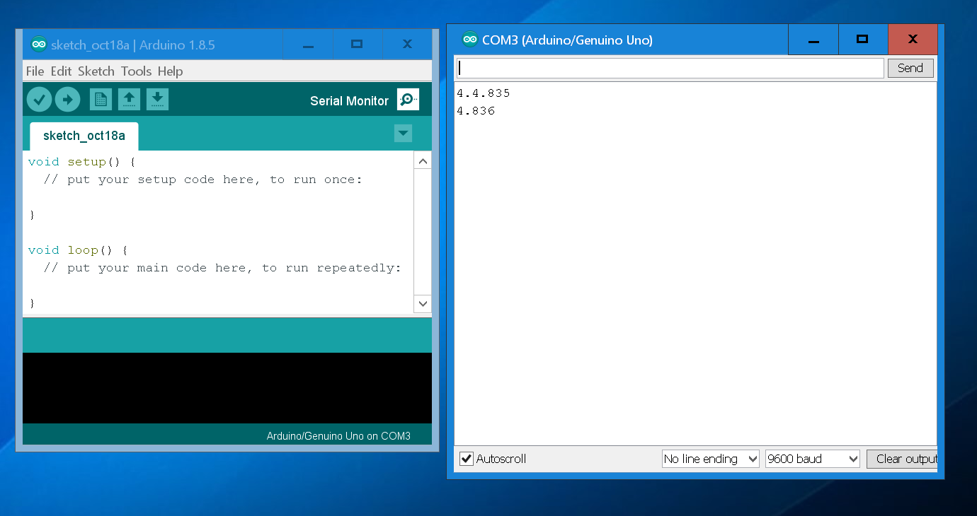 To tell the Arduino that the current amount of Hydrogen Ions and Hydroxide Ions it is reading is equal to 10.00 pH, enter this into the top box of the serial monitor, then hit return:
