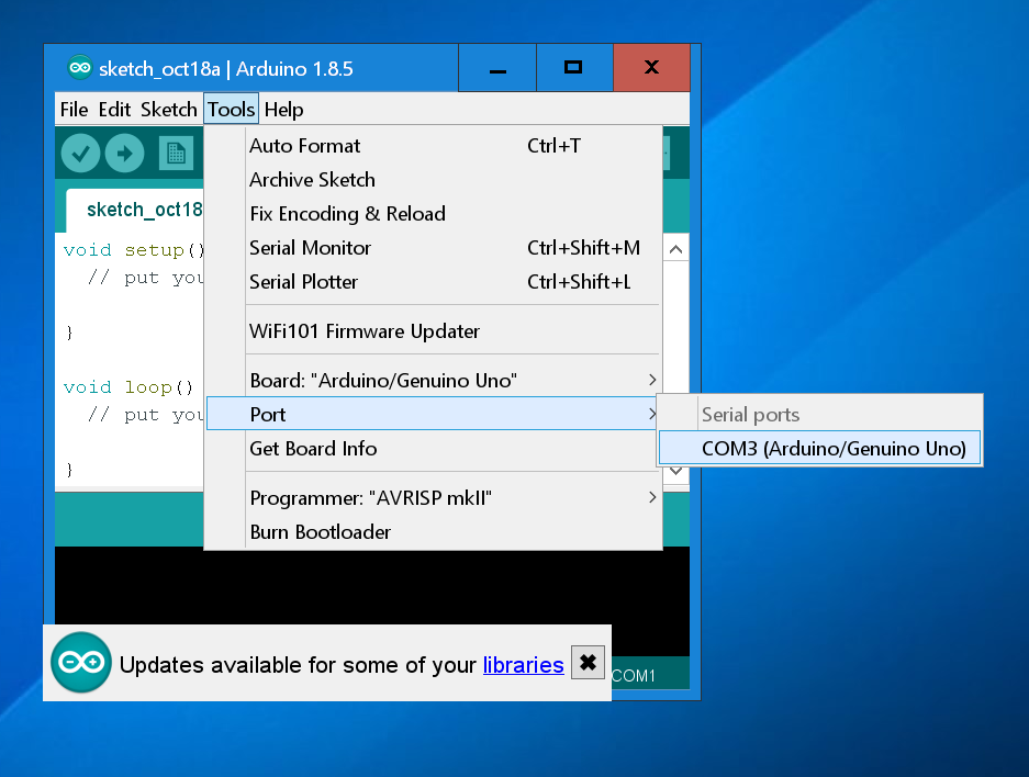 We need to select the "Port" on the computer that should be used to receive data from the pH probe and Arduino. Click on the Tools menu at the top of the IDE, then click on "Port". The computer should show a list of ports with one of them indicating that the Arduino is attached. In the picture, this computer found the Arduino attached to the COM3 communications port. Click on the correct COM port for your computer and a checkmark will show that it is selected.