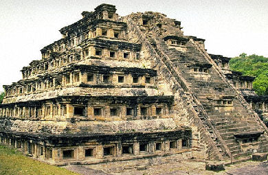 This unique and intricate little pyramid is located in El Tajin, on the central Gulf coast in Veracruz. Its builders are mysterious and may have been either Totonac or Huasteca. El Tajin flourished at the same time as the Maya, and there is evidence that the builders of El Tajin and the Maya had a trade relationship. The pyramid has 365 niches, representing the solar year, and is almost perfectly symmetrical.