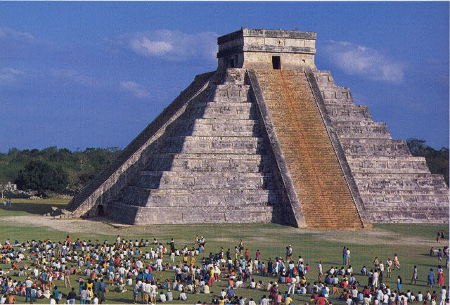 One of the most famous ancient structures in the world, El Castillo (The Castle) is located in Chichen Itza, on the Yucatan peninsula. What you see was built about 1100AD over the top of a much older pyramid. El Castillo exhibits many elements of the elaborate Mayan calendar system. The solar calendar is represented by the stairs, which total 365. There are 9 tiers, which when split by the staircases yields 18, the number of months in a year. There are 52 decorative panels on each side, equalling the number of years in the calendar cycle. In addition, on the solstices and equinoxes, unique shadows were cast by the pyramid edges on the stairs, marking both these significant religious events and as an indicator it was time to plant.