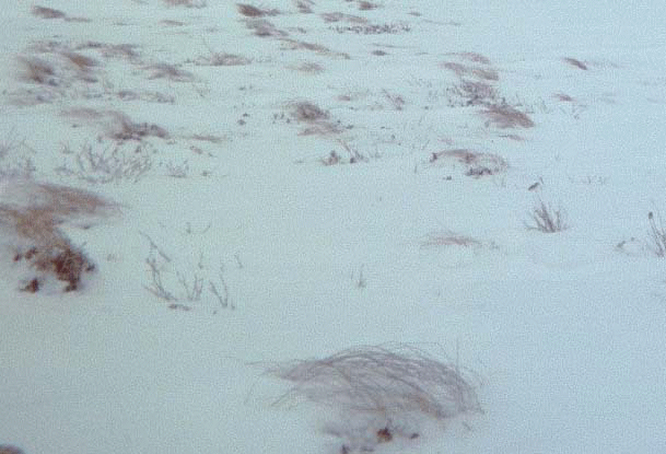 Tundra is land covered with low bushes, and few trees. The high grass blows in the direction of the wind. The first snow covers the high grass pressing close to the ground. The cold temperatures freeze the grass into position. On the tundra Fred George uses the frozen grass to find direction.
